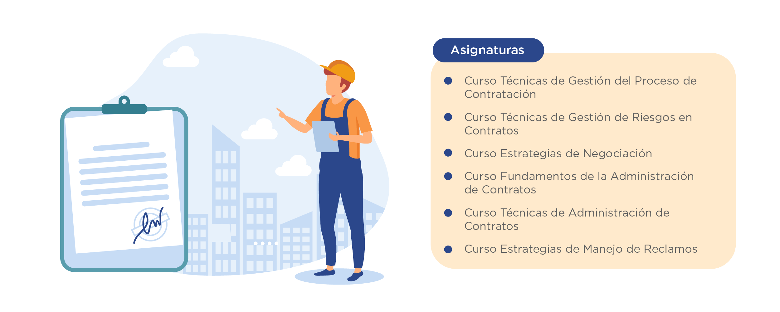 El Diplomado en Administración de Contratos es un programa semestral que contiene 6 asignaturas con actividades teóricas y prácticas en un total de 153 horas pedagógicas.