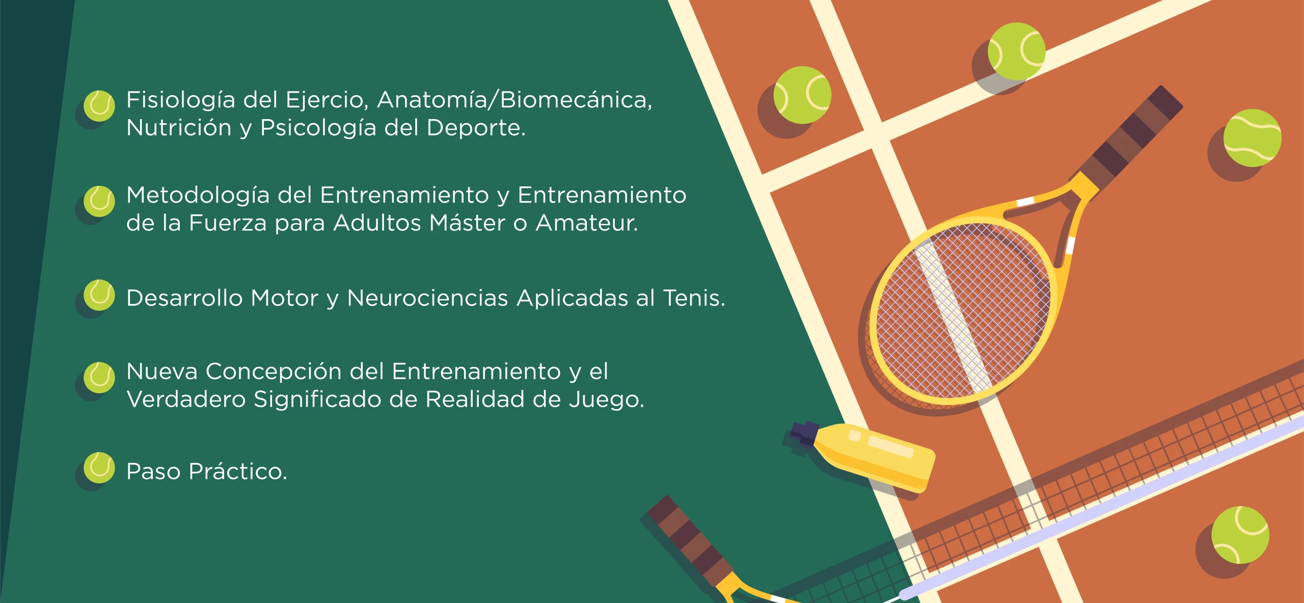 El Diplomado en Desarrollo de la Fuerza y Entrenamiento Innovador del Tenis, para Tenistas Máster o Amateur contiene 5 asignaturas, que se imparten semestralmente, según sea el caso, con un total de 116 horas pedagógicas.