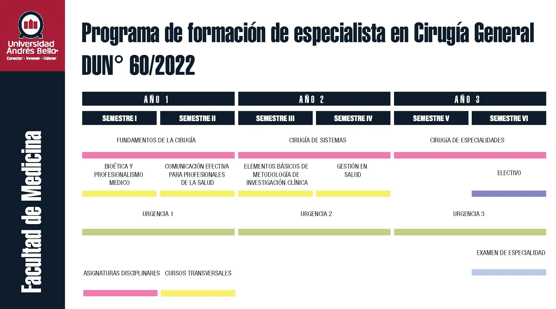 El Programa de formación de especialistas en Cirugía General para médicos cirujanos dura tres años y se desarrolla en el Hospital El Pino de San Bernardo (SSMS) y Clínica INDISA de Providencia bajo tuición de la Facultad de Medicina de la Universidad Andrés Bello.